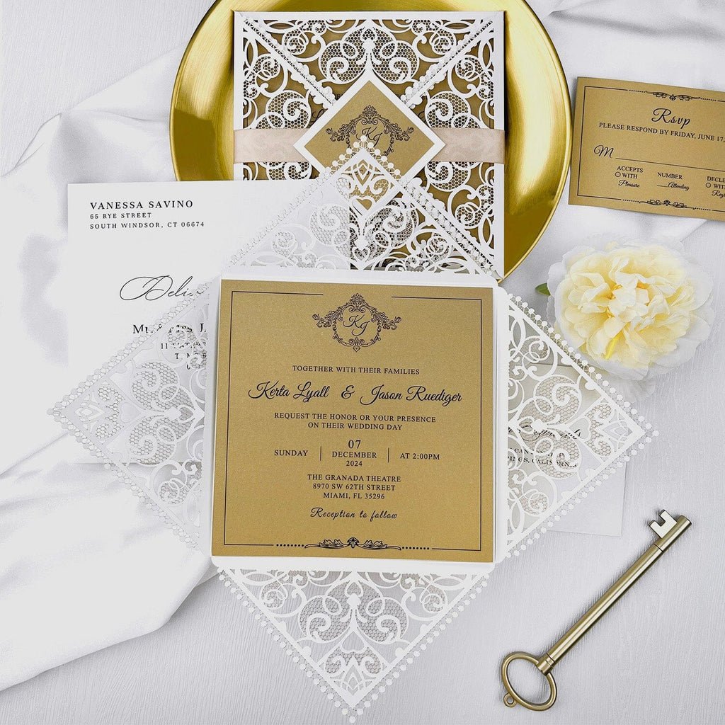 Laser Cut White and Gold Wedding Invitations, Square Floral Lace Weddi